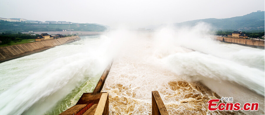 The 2014 Yellow River Xiaolangdi Waterfall-Watching Festival kicks off at the Xiaolangdi reservoir in Luoyang of central China's Henan province on June 30, 2014. The festival will last till July 5. [Photo: China News Service / Cheng Hao]