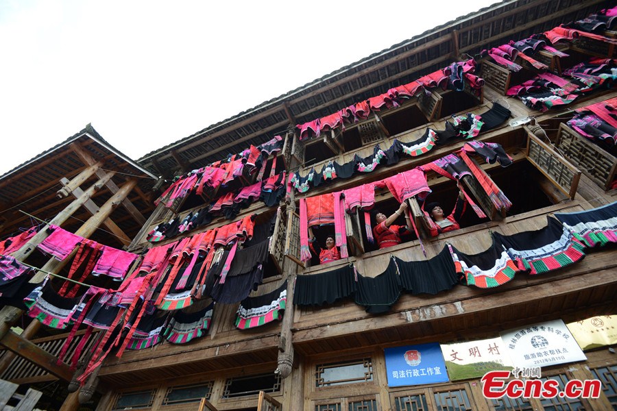 Girls of Red Yao tribe who lives in a village under Guilin city in Guangxi, put clothes under the sun to mark the traditional Shaiyi (Clothes Drying) Festival on July 2, 2014. The Red Yao tribe is a branch of Yao ethnic group, and it is a traditional custom for people of the tribe to put clothes under the sun during the festival which falls on the sixth day of the sixth month on the Chinese lunar calendar. [Photo: China News Service/ Wei Jiyang]