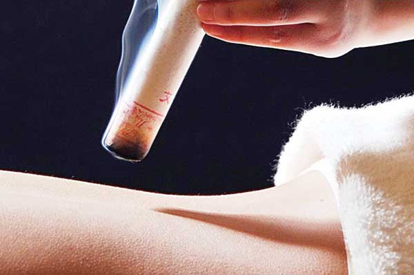 This is the application of heat from the burning of a small bundle of tightly bound herbs, or moxa, on targeted acupoints.