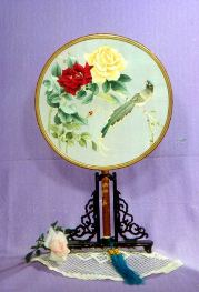 Silk fans are also called Round Fans. They are fine and elegant with paintings, calligraphy or embroidery on the fans, all of which are unique. On the handles of the fans, there are colored drawings or patterns. The fans are made of plain bamboo, princes bamboo, ivory, or hawksbill, which is refined and not vulgar.