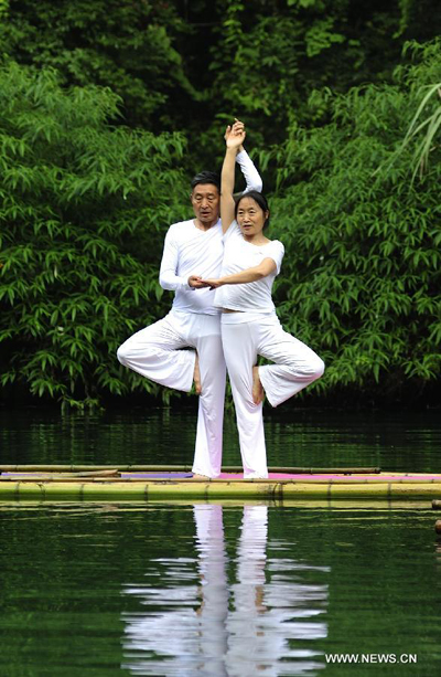 Enthusiasts practise yoga on a bamboo raft, with the Sanxia "bamboo sea" scenery spot in the background, in Zigui County, Yichang, central China's Hubei Province, July 6, 2014. (Xinhua/Wang Jiaman)