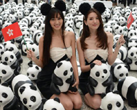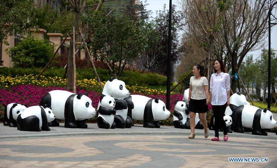 Two citizens look at panda figures displayed during the open-air show "1st Panda" in Shenyang, capital of northeast China's Liaoning Province, July 7, 2014. A hundred panda figures made from bamboo scraps are shown during the event, which aims at promoting environmental awareness. (Xinhua/Pan Yulong)