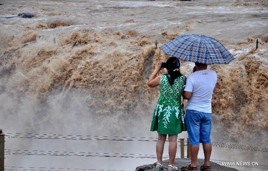 Tourists take photos of the Hukou Waterfall of the Yellow River, north China's Shanxi Province, July 9, 2014. (Xinhua/Fan Minda)