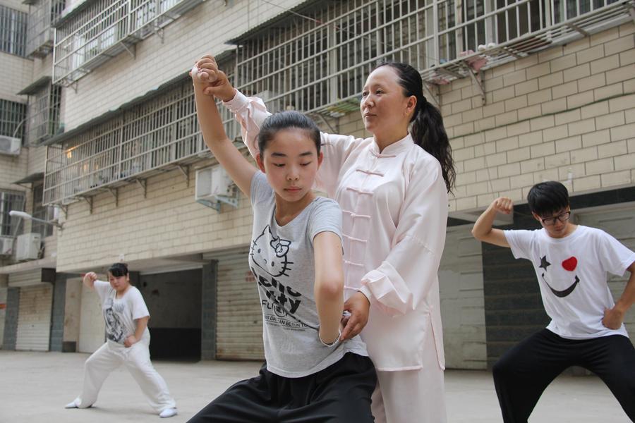 Ateacher instructs a student in playing tai chi in Wenxian county of Jiaozuo city, Central China's Henan province, July 8, 2014. Many primary and middle school students in Wenxian took part in tai chi training classes during the summer vacation. [Photo/Xinhua]