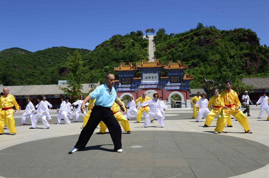 Nearly 100 Tai Chi devotees from Spain and Beijing practiced Tai Chi under instruction from Chen Xiang, a skilled Chinese Tai Chi master at the Yaji Mountain, a sacred mountain of Taoism, in Liujiadian Town in Beijing's Pinggu District, on July 10, 2014. The district government is developing Liujiadian into a town featuring Tai Chi culture. Tai Chi is practiced by around 150 million people in more than 150 countries and regions. [Photo provided to China.org.cn]