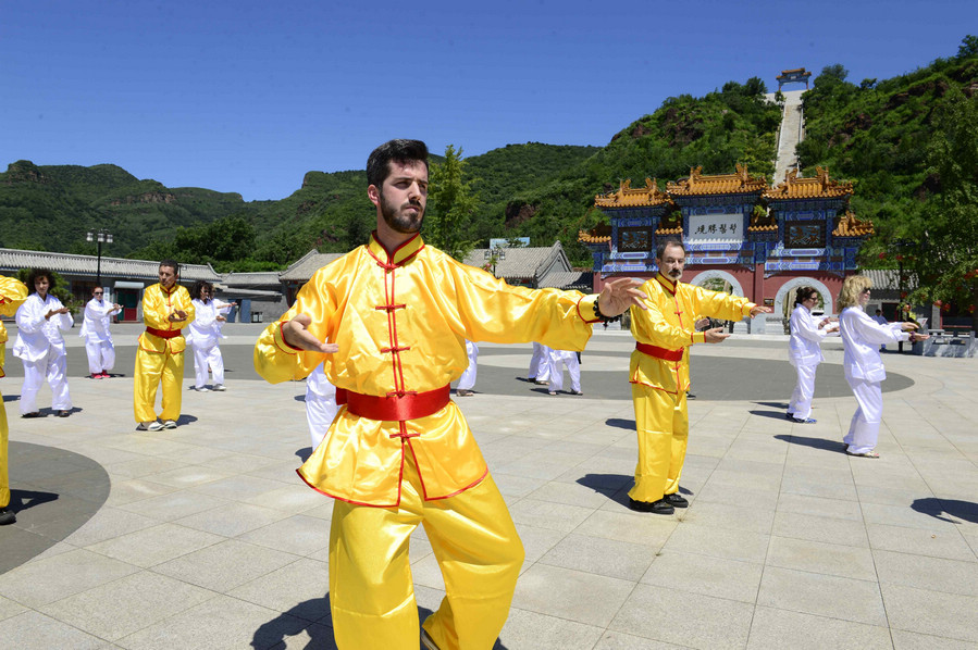 Nearly 100 Tai Chi devotees from Spain and Beijing practiced Tai Chi under instruction from Chen Xiang, a skilled Chinese Tai Chi master at the Yaji Mountain, a sacred mountain of Taoism, in Liujiadian Town in Beijing's Pinggu District, on July 10, 2014. The district government is developing Liujiadian into a town featuring Tai Chi culture. Tai Chi is practiced by around 150 million people in more than 150 countries and regions. [Photo provided to China.org.cn]