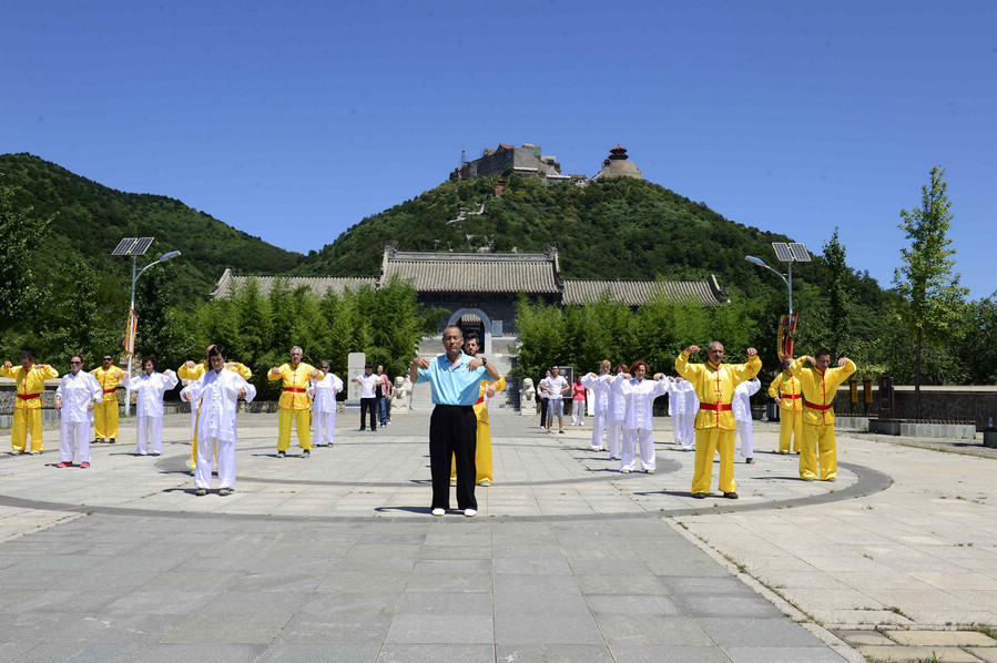 Nearly 100 Tai Chi devotees from Spain and Beijing practiced Tai Chi under instruction from Chen Xiang, a skilled Chinese Tai Chi master at the Yaji Mountain, a sacred mountain of Taoism, in Liujiadian Town in Beijing's Pinggu District, on July 10, 2014. The district government is developing Liujiadian into a town featuring Tai Chi culture. Tai Chi is practiced by around 150 million people in more than 150 countries and regions. [Photo provided to China.org.cn]
