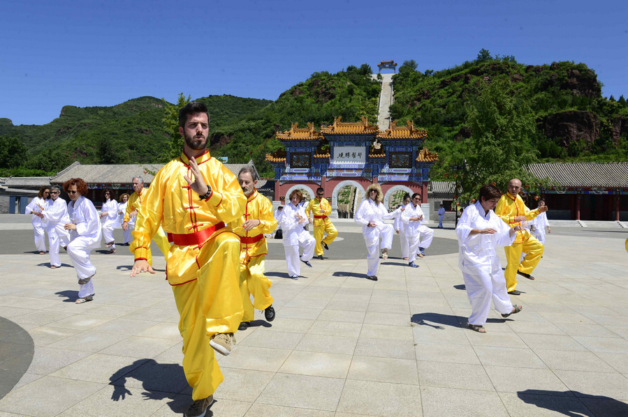 Nearly 100 Tai Chi devotees from Spain and Beijing practiced Tai Chi under instruction from Chen Xiang, a skilled Chinese Tai Chi master at the Yaji Mountain, a sacred mountain of Taoism, in Liujiadian Town in Beijing's Pinggu District, on July 10, 2014. The district government is developing Liujiadian into a town featuring Tai Chi culture. Tai Chi is practiced by around 150 million people in more than 150 countries and regions. [Photo provided to China.org.cn]