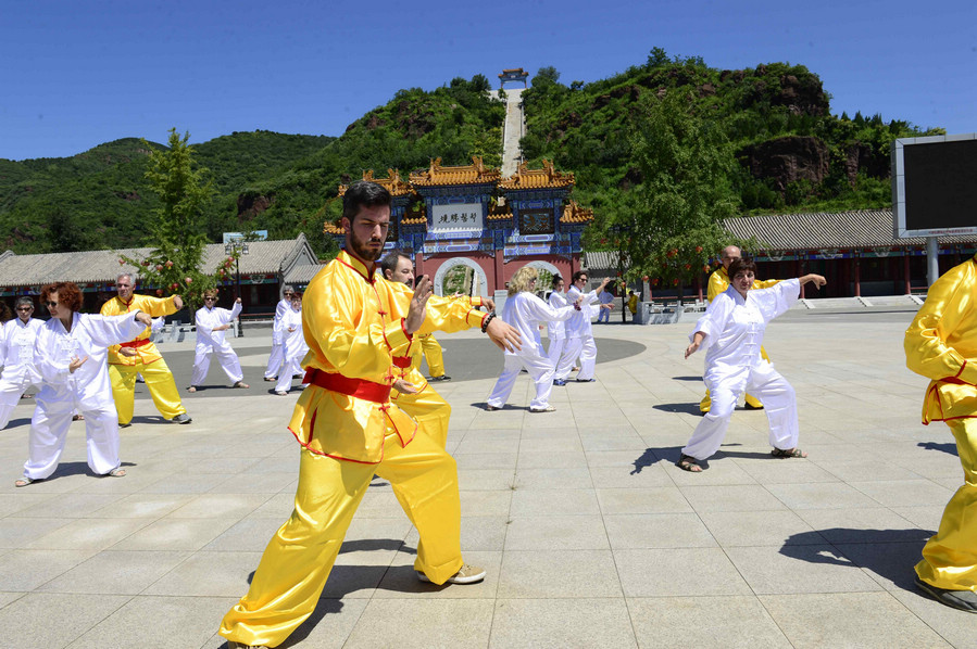 Nearly 100 Tai Chi devotees from Spain and Beijing practiced Tai Chi under instruction from Chen Xiang, a skilled Chinese Tai Chi master at the Yaji Mountain, a sacred mountain of Taoism, in Liujiadian Town in Beijing's Pinggu District, on July 10, 2014. The district government is developing Liujiadian into a town featuring Tai Chi culture. Tai Chi is practiced by around 150 million people in more than 150 countries and regions. [Photo provided to China.org.cn]
