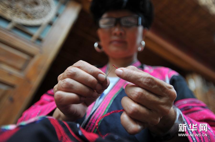 48-year-old representative heiress of intangible cultural heritage of Yao costumes Pan Jifeng is preparing to embroider a Yao costume.