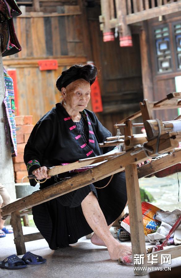80-year-old woman Pan Xinmei spins cloth to make a Yao costume.