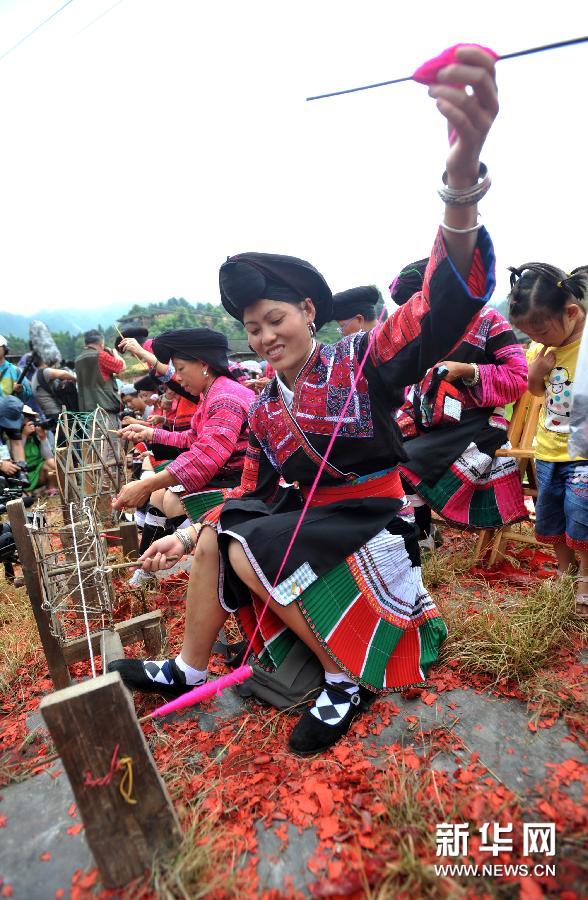 Several Yao women show their cloth spinning skills while making Yao costumes.