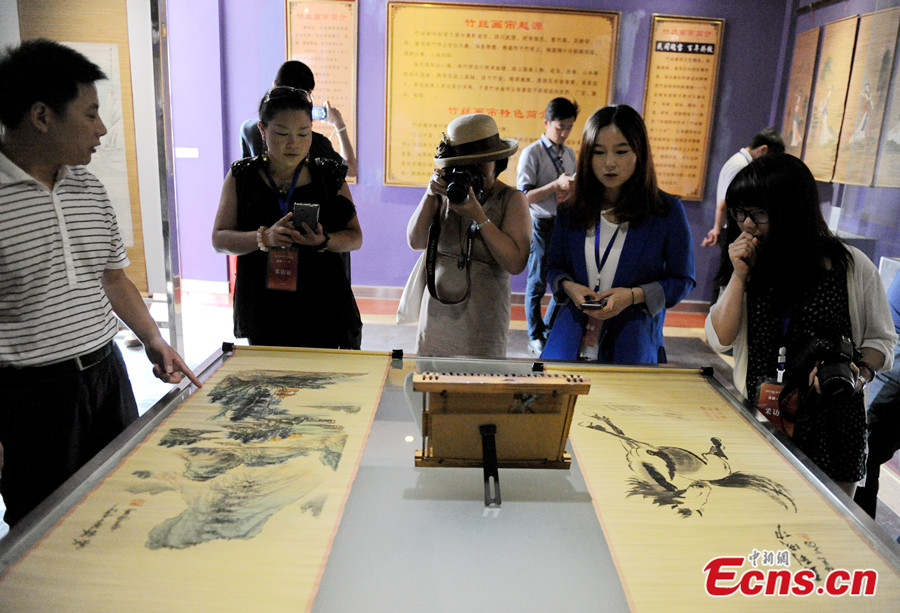Visitors take photos of bamboo curtains with traditional Chinese paintings at Zhangjiayuanzi village of Feilong town in Wusheng county of southwest China's Sichuan province on July 14, 2014. Feilong town is famous for its bamboo curtain arts and crafts. Drawing traditional Chinese paintings on bamboo curtains has a history of over 1,000 years and the crafts entered Feilong town during Guangxu Period of Qing Dynasty (1875-1908). The craftsmen in Feilong town developed the traditional arts by combining embroidery skills. [Photo: China News Service / Liu Zhong Jun]