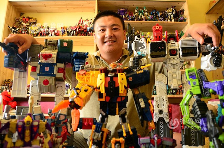 Zhang Wei poses for a photo with transformer models at his living room in Qingdao city of east China's Shandong province. Zhang Wei and his wife Shi Yunting have collected more than 380 transformer models in 12 years, which cost them over 200,000 yuan (US$32,200). [Photo/iqilu.com]