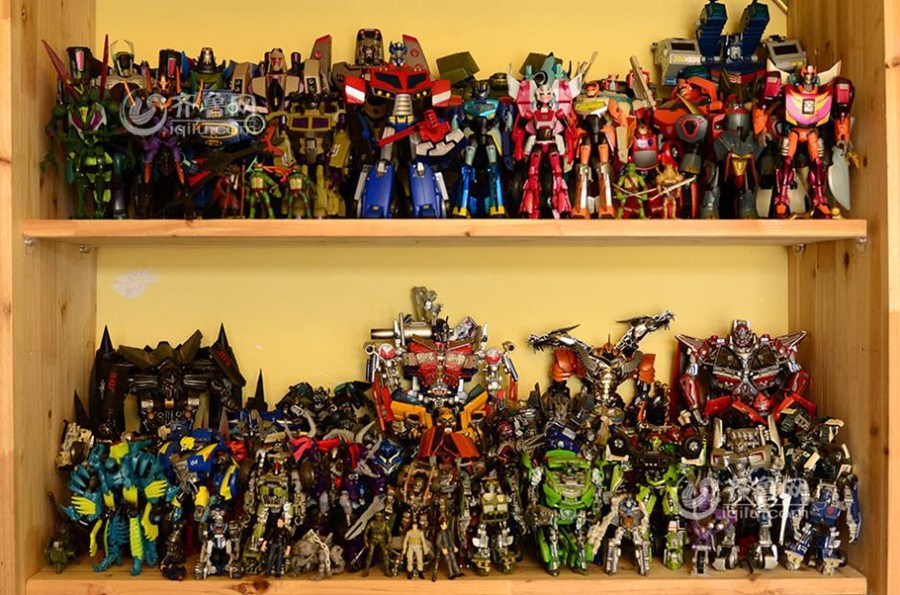 Transformer models are displayed at Zhang Wei and Shi Yunting's living room in Qingdao city of east China's Shandong province. The young couple has collected more than 380 transformer models in 12 years, which cost them over 200,000 yuan (US$32,200). [Photo/iqilu.com]