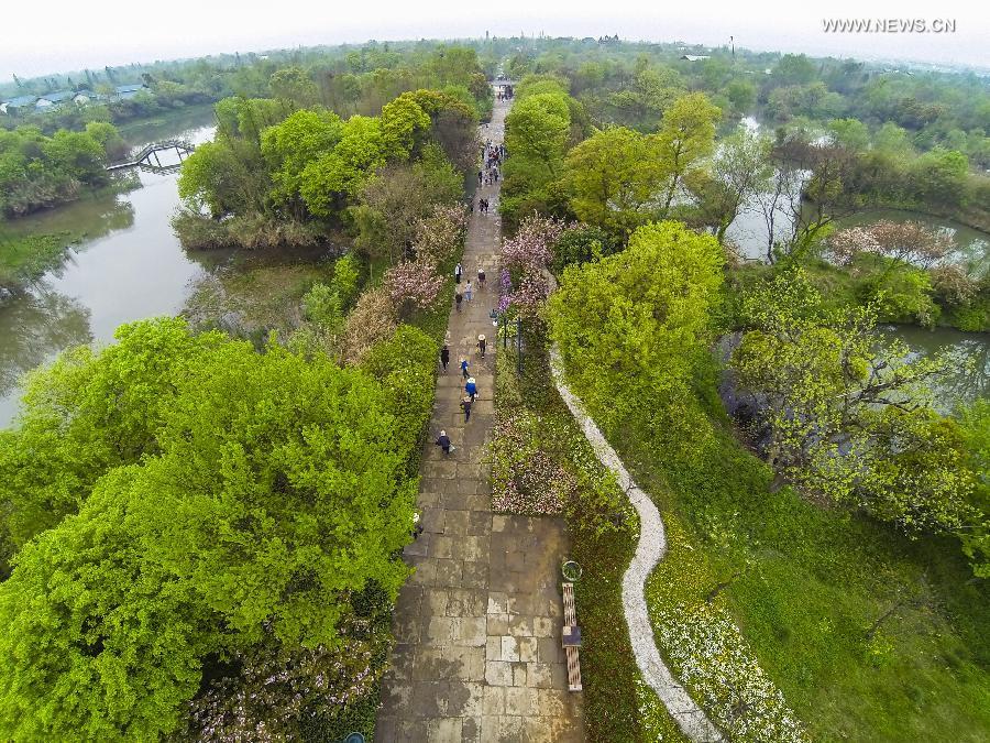 Aerial photo taken on April 2, 2014 shows the spring scenery of the Xixi Wetland in Hangzhou, capital of east China's Zhejiang Province. (Xinhua/Xu Yu)