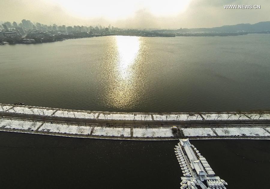 Aerial photo taken on Feb. 10, 2014 shows winter snow of the West Lake in Hangzhou, capital of east China's Zhejiang Province. (Xinhua/Xu Yu)