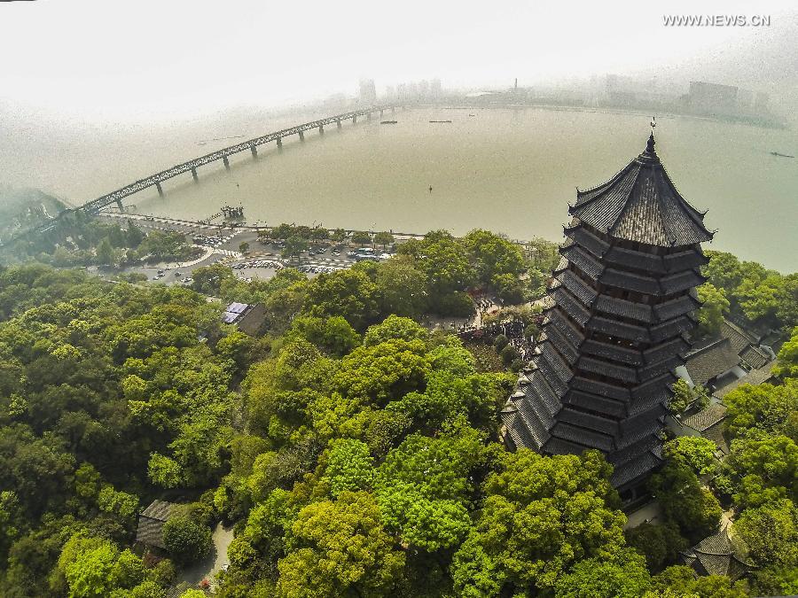 Aerial photo taken on April 10, 2014 shows the Liuhe Pagoda near the Qiantang River Bridge in Hangzhou, capital of east China's Zhejiang Province. (Xinhua/Xu Yu)