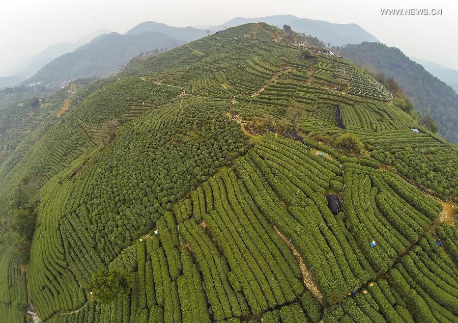 Aerial photo taken on March 20, 2014 shows Longjing Tea Garden in Hangzhou, capital of east China's Zhejiang Province. (Xinhua/Xu Yu)