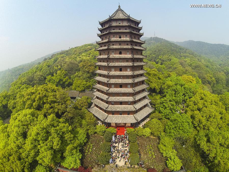 Aerial photo taken on April 10, 2014 shows the Liuhe Pagoda in Hangzhou, capital of east China's Zhejiang Province. (Xinhua/Xu Yu)