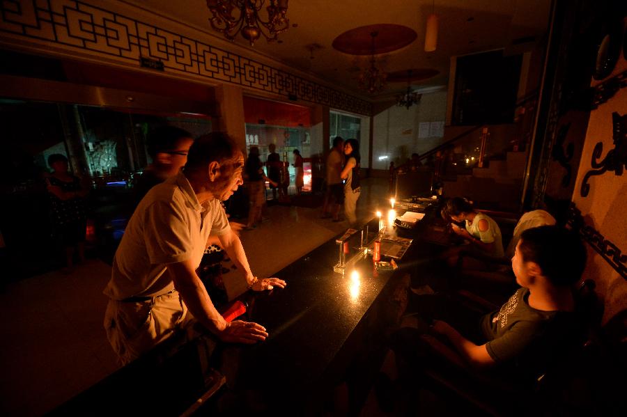 Displaced people are seen in a settlement lit by candles due to the lack of electricity in the tourist destination of Fenghuang, central China's Hunan Province, July 16, 2014. Hunan Province has been ravaged by heavy rains since early Monday morning, where 1.722 million people were affected and 283,000 people were evacuated. (Xinhua/Bai Yu)