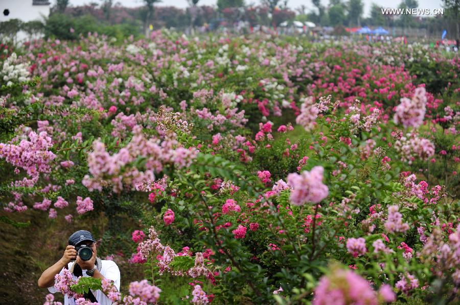 Tourists view blossoming plants of crape myrtle at a local cultivation base in Wuhan, capital of central China's Hubei Province, July 19, 2014. (Xinhua/Hao Tongqian)
