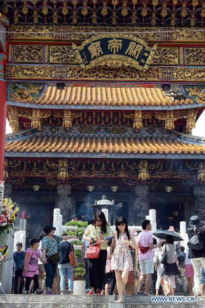 People visit a Temple on the China Street in Yokohama, Japan, on July 20, 2014. The China Street in Yokohama has a history of over 150 years. (Xinhua/Ma Ping)