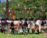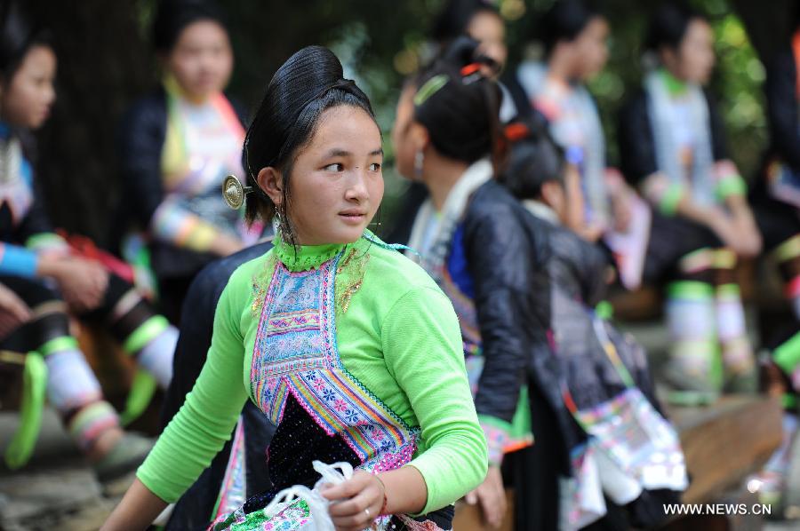 Photo taken on July 23, 2014 shows a girl of the Miao ethnic group in their folk costumes at Biasha, a Miao ethic village in Congjiang County, Miao-Dong Autonomous Prefecture of Qiandongnan, southwest China's Guizhou Province. The local Miao people here stick to their traditional costumes dating back to thousands of years. Though guns are strictly regulated in China, men in Biasha are permitted to carry and use guns as to protect their tradition. Therefore, Biasha is called as the last gunslinger village in China and this draws more and more tourists here. (Xinhua/Tao Liang)