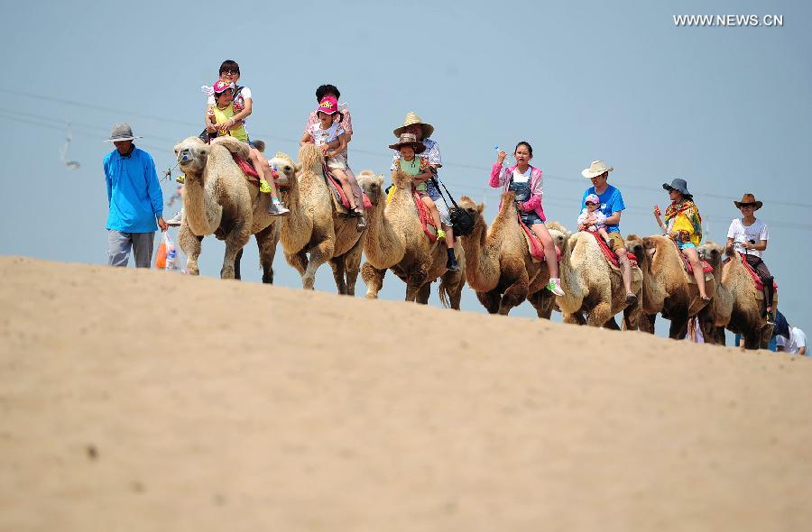 Tourists ride camels in the desert of Shahu Lake scenic spot in northwest China's Ningxia Hui Autonomous Region, July 27, 2014. As the summer peak season comes, Shahu Lake, the desert wetlands, is expected to receive 20,000 tourist visits per day. (Xinhua/Peng Zhaozhi)