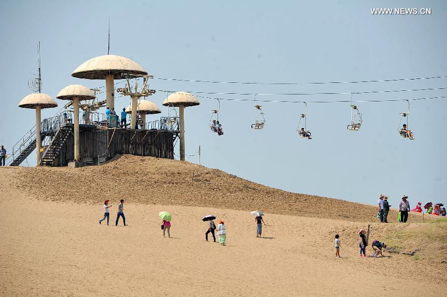 Tourists take cable cars over the desert in Shahu Lake scenic spot in northwest China's Ningxia Hui Autonomous Region, July 27, 2014. As the summer peak season comes, Shahu Lake, the desert wetlands, is expected to receive 20,000 tourist visits per day. (Xinhua/Peng Zhaozhi)