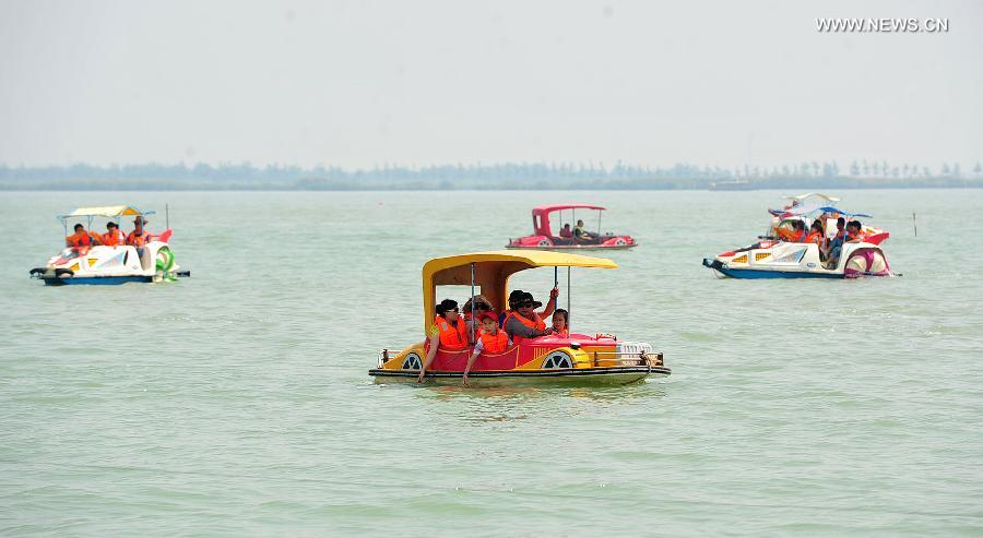 Tourists amuse themselves on boats in Shahu Lake scenic spot in northwest China's Ningxia Hui Autonomous Region, July 27, 2014. As the summer peak season comes, Shahu Lake, the desert wetlands, is expected to receive 20,000 tourist visits per day. (Xinhua/Peng Zhaozhi)