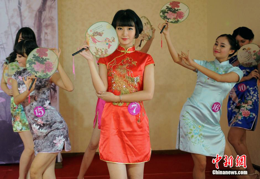 Girls display the beauty of Qipao (Mandarin Gown) and school uniforms with special features during the 2014 Chengdu Most Beautiful Contest with the blooming years as the theme in Chengdu, southwest China’s Sichuan province, August 2, 2014. (Chinanews.com/ Ye Jian)