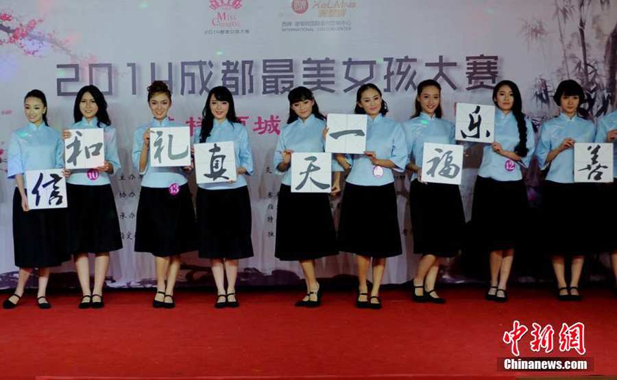 Girls display the beauty of Qipao (Mandarin Gown) and school uniforms with special features during the 2014 Chengdu Most Beautiful Contest with the blooming years as the theme in Chengdu, southwest China’s Sichuan province, August 2, 2014. (Chinanews.com/ Ye Jian)