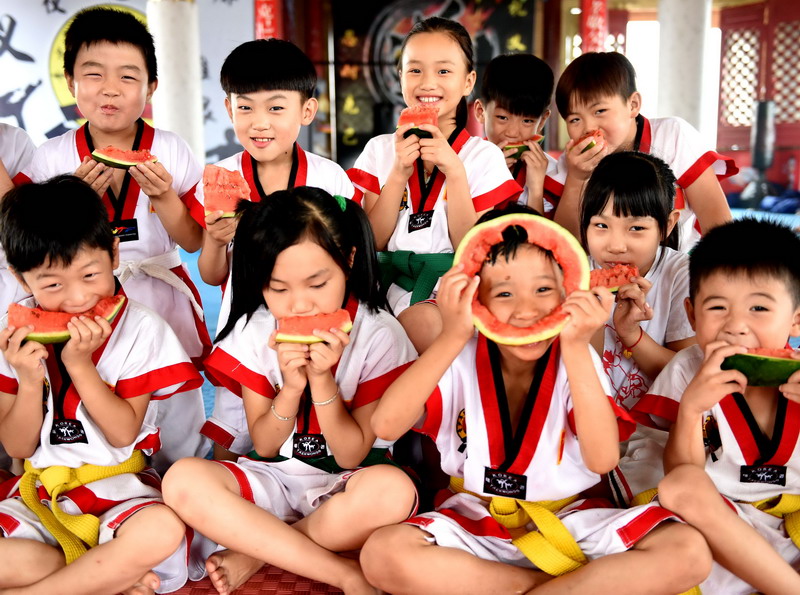 Children devour watermelon at a youth center in Haozhou of East China's Anhui province on Aug 6, 2014. Eating watermelon honors an age-old folk tradition of embracing Start of Autumn (Liqiu), one of the 24 traditional Chinese solar terms that marks the beginning of autumn. People also eat peaches to mark Start of Autumn. By eating the fruit, it is hoped that the scorching summer will be bitten away and a comfortable, cool fall will follow.[Photo by Liu Qinli/asianewsphoto.com]