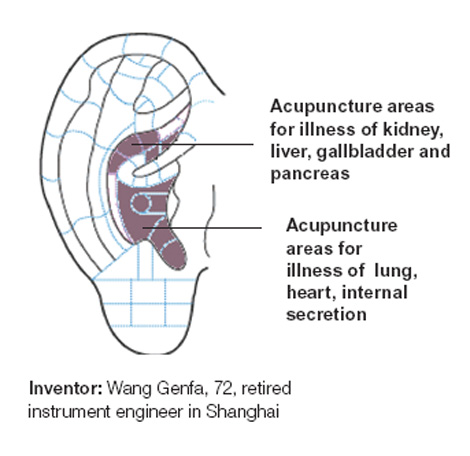 He says it's as effective as needles to relieve problems such as high blood pressure, gallstones, enlarged prostate, symptoms of menopause, insomnia, constipation, diarrhea, abscessed finger and toenails.