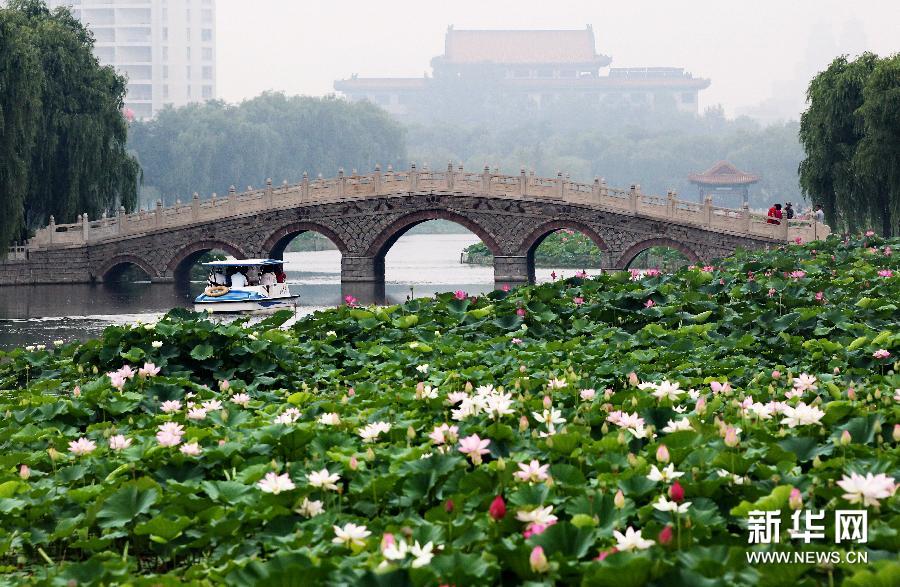 Tourists take boats to appreciate blooming lotuses in Nandaihe Daguan Garden on July 21. [Photo/Xinhua]