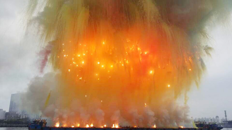 Shanghai citizens watch a fireworks display during day time near Huangpu River in Shanghai, Aug 8, 2014. The fireworks were presented by celebrity Chinese artist Cai Guoqiang, before his solo exhibition Jiuji Lang (nine waves) at Power Station of Art in Shanghai. The fireworks lasted about 10 minutes and generated heavy smoke above Huangpu River, which led some surprised citizens to call the police 110 hotline. The artist is best known for his fireworks displays at the 2008 Beijing Olympics'opening and closing ceremonies.