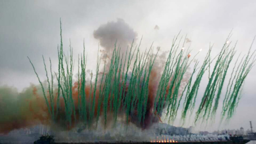 Shanghai citizens watch a fireworks display during day time near Huangpu River in Shanghai, Aug 8, 2014. The fireworks were presented by celebrity Chinese artist Cai Guoqiang, before his solo exhibition Jiuji Lang (nine waves) at Power Station of Art in Shanghai. The fireworks lasted about 10 minutes and generated heavy smoke above Huangpu River, which led some surprised citizens to call the police 110 hotline. The artist is best known for his fireworks displays at the 2008 Beijing Olympics'opening and closing ceremonies.