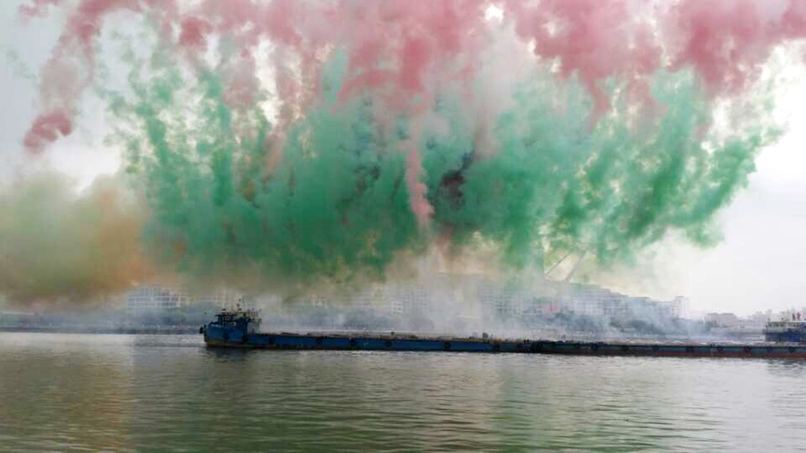 Shanghai citizens watch a fireworks display during day time near Huangpu River in Shanghai, Aug 8, 2014. The fireworks were presented by celebrity Chinese artist Cai Guoqiang, before his solo exhibition Jiuji Lang (nine waves) at Power Station of Art in Shanghai. The fireworks lasted about 10 minutes and generated heavy smoke above Huangpu River, which led some surprised citizens to call the police 110 hotline. The artist is best known for his fireworks displays at the 2008 Beijing Olympics'opening and closing ceremonies.
