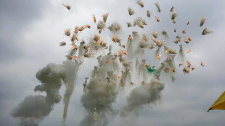 Shanghai citizens watch a fireworks display during day time near Huangpu River in Shanghai, Aug 8, 2014. The fireworks were presented by celebrity Chinese artist Cai Guoqiang, before his solo exhibition Jiuji Lang (nine waves) at Power Station of Art in Shanghai. The fireworks lasted about 10 minutes and generated heavy smoke above Huangpu River, which led some surprised citizens to call the police 110 hotline. The artist is best known for his fireworks displays at the 2008 Beijing Olympics'opening and closing ceremonies.