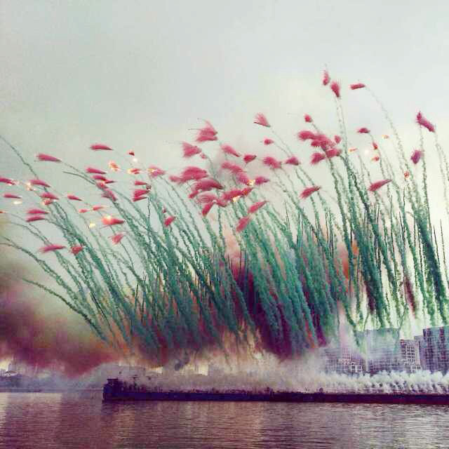 Shanghai citizens watch a fireworks display during day time near Huangpu River in Shanghai, Aug 8, 2014. The fireworks were presented by celebrity Chinese artist Cai Guoqiang, before his solo exhibition Jiuji Lang (nine waves) at Power Station of Art in Shanghai. The fireworks lasted about 10 minutes and generated heavy smoke above Huangpu River, which led some surprised citizens to call the police 110 hotline. The artist is best known for his fireworks displays at the 2008 Beijing Olympics'opening and closing ceremonies.
