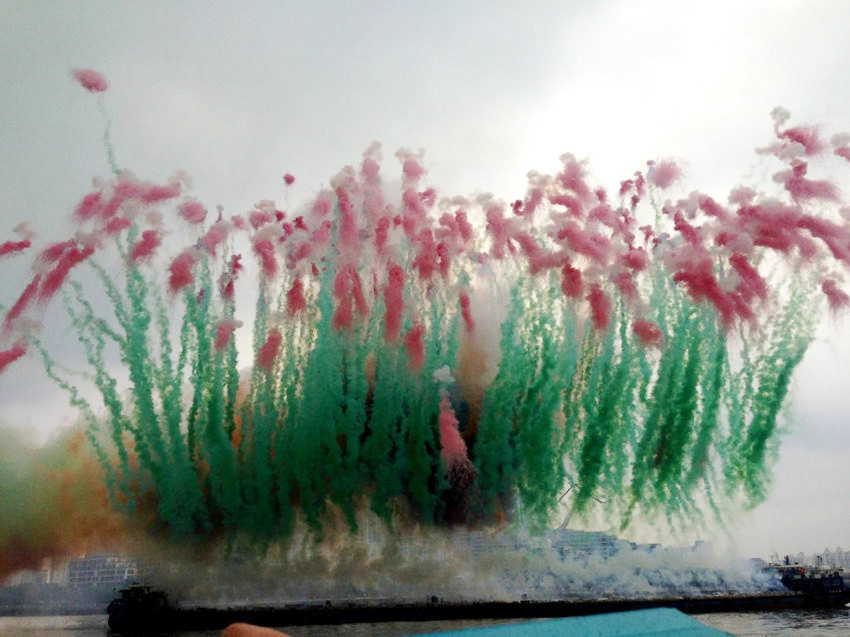 Shanghai citizens watch a fireworks display during day time near Huangpu River in Shanghai, Aug 8, 2014. The fireworks were presented by celebrity Chinese artist Cai Guoqiang, before his solo exhibition Jiuji Lang (nine waves) at Power Station of Art in Shanghai. The fireworks lasted about 10 minutes and generated heavy smoke above Huangpu River, which led some surprised citizens to call the police 110 hotline. The artist is best known for his fireworks displays at the 2008 Beijing Olympics'opening and closing ceremonies.