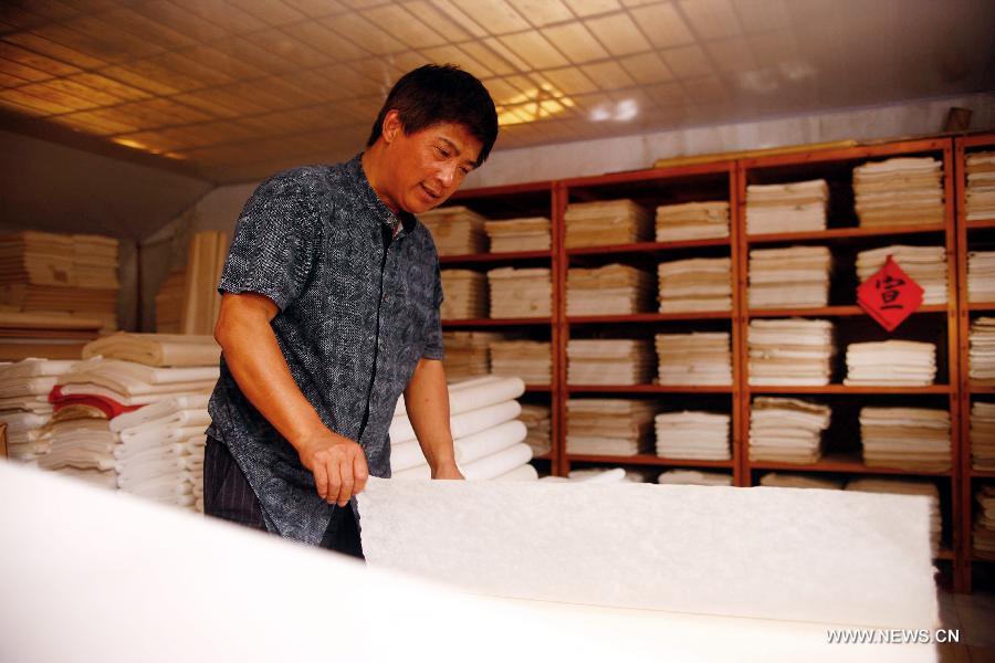 Cao Jianqin examines a piece of Xuan paper in his company in Jingxian County of Xuancheng, east China's Anhui Province, May 27, 2014. Cao Jianqin is a Xuan paper artisan based in Jingxian County of Anhui. The Xuan paper is a soft, fine-textured paper used in both Chinese calligraphy and painting. Cao Jianqin was born into a family with a long tradition of Xuan paper making. He started to learn the techniques of making Xuan paper from his father, when he graduated from high school in 1980. He ran his own Xuan paper company, called "Zijinlou", in 1986 and registered the trademark "Cao's" three years later. Over the years, Cao Jianqin has been devoted to the preservation and revival of the Xuan paper. His company participated in many projects which involves the renovation or restoration of ancient documents and architectures. In 2000, Cao opened his Xuan paper store in Liulichang, a street in Beijing that is known for its book stores and stationery retailers. (Xinhua/Zhu Weixi)