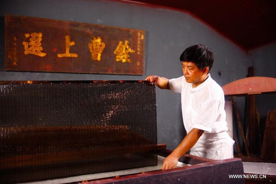 Cao Jianqin makes Xuan paper in his company in Jingxian County of Xuancheng, east China's Anhui Province, July 30, 2014. Cao Jianqin is a Xuan paper artisan based in Jingxian County of Anhui. The Xuan paper is a soft, fine-textured paper used in both Chinese calligraphy and painting. Cao Jianqin was born into a family with a long tradition of Xuan paper making. He started to learn the techniques of making Xuan paper from his father, when he graduated from high school in 1980. He ran his own Xuan paper company, called "Zijinlou", in 1986 and registered the trademark "Cao's" three years later. Over the years, Cao Jianqin has been devoted to the preservation and revival of the Xuan paper. His company participated in many projects which involves the renovation or restoration of ancient documents and architectures. In 2000, Cao opened his Xuan paper store in Liulichang, a street in Beijing that is known for its book stores and stationery retailers. (Xinhua/Zhu Weixi)