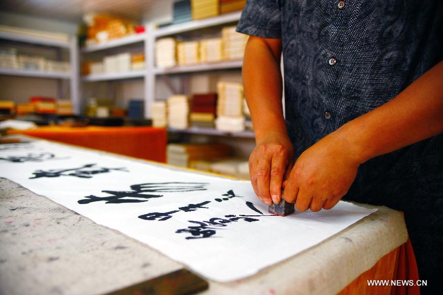 Cao Jianqin tests a piece of Xuan paper in his company in Jingxian County of Xuancheng, east China's Anhui Province, May 27, 2014. Cao Jianqin is a Xuan paper artisan based in Jingxian County of Anhui. The Xuan paper is a soft, fine-textured paper used in both Chinese calligraphy and painting. Cao Jianqin was born into a family with a long tradition of Xuan paper making. He started to learn the techniques of making Xuan paper from his father, when he graduated from high school in 1980. He ran his own Xuan paper company, called "Zijinlou", in 1986 and registered the trademark "Cao's" three years later. Over the years, Cao Jianqin has been devoted to the preservation and revival of the Xuan paper. His company participated in many projects which involves the renovation or restoration of ancient documents and architectures. In 2000, Cao opened his Xuan paper store in Liulichang, a street in Beijing that is known for its book stores and stationery retailers. (Xinhua/Zhu Weixi)