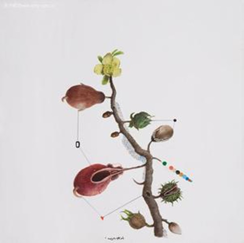 He appreciates the physical qualities of his art almost as much as the content. He speaks of “the relationship between the canvas and the artist” and says that subject matter is just a means for implementing the act of putting line and form to canvas. When I mention that I’ve noticed an inclination to deal with “organic” subjects like Magnify, 2005, Dachun tells me that everything he paints is organic in some way and besides, he likes the detail.