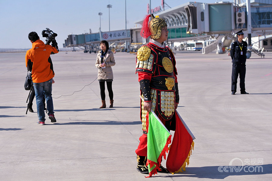 A man in ancient costume performs at the opening ceremony of the first international direct flights from Seoul to Yinchuan at Hedong International airport in northwest China’s Ningxia on March 24, 2012. (Photo/CNTV)