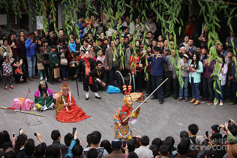 People disguised as the characters in the Journey to West appear in the street of Ningbo in Zhejiang province on April 20, 2014, which has attracted people’s attention. (Photo/CNTV)