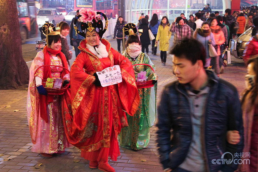 Women dressed in imperial concubine costume sell apples in the street in Xi’an on Dec. 12, 2012. (Photo/CNYV)