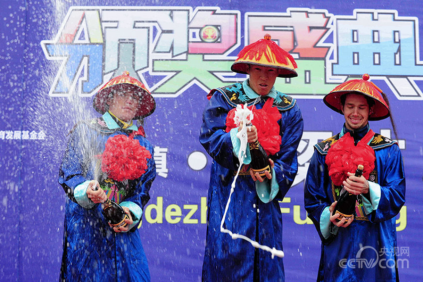 A player in ancient costume receives the award at the second stage of Poyang Lake cycling race 2013 in Jingdezhen, Jiangxi province on Nov. 24, 2013. (Photo/CNTV)